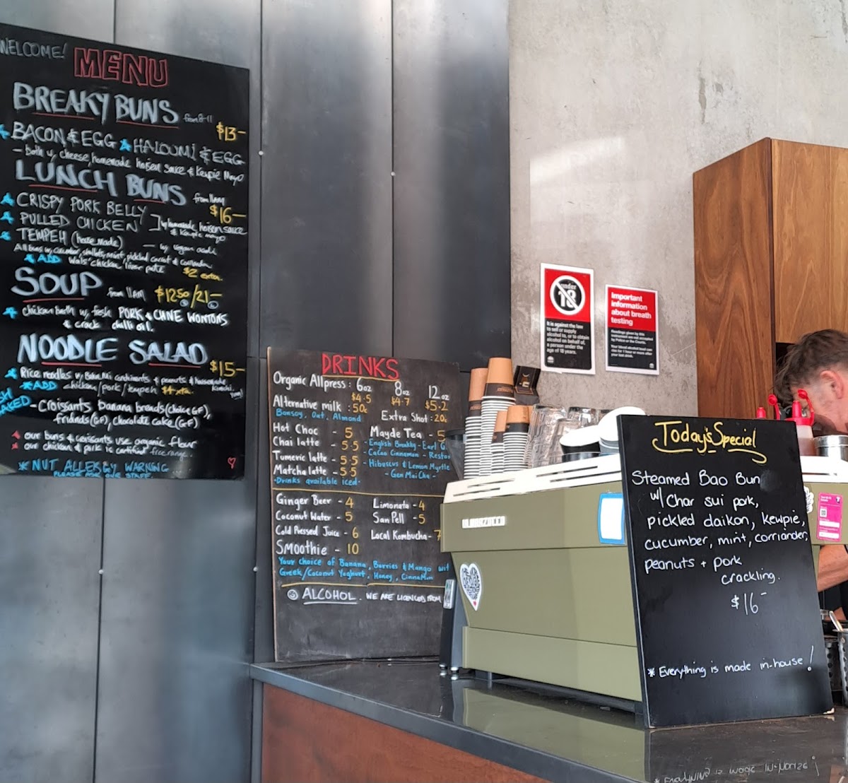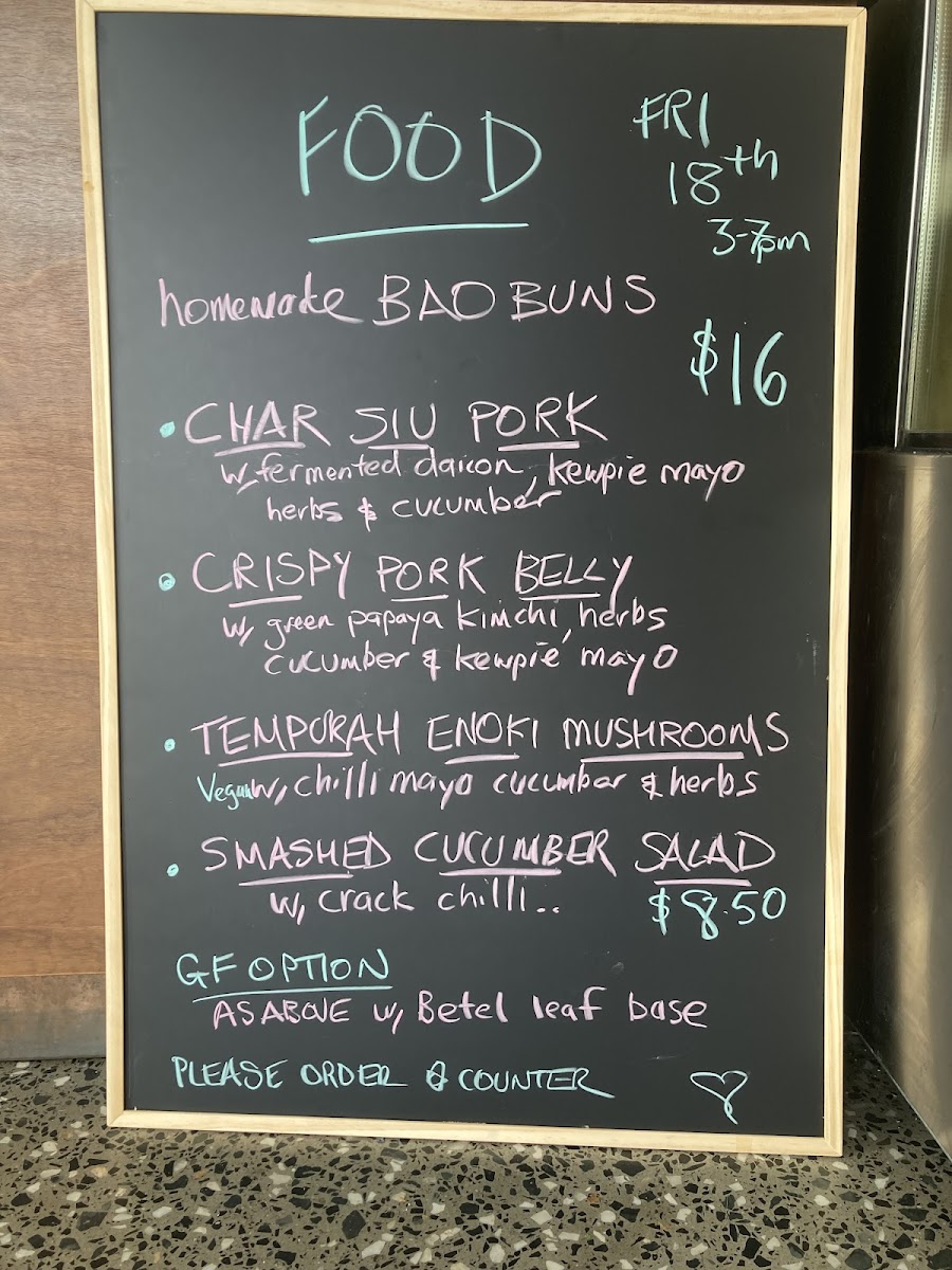 Breakfast offerings include savory buns such as the Bacon and Egg Roll, made with local free-range bacon, egg, cheese, housemade hoisin, and kewpie mayo, as well as a Halloumi and Egg Bun with similar accompaniments. These items are designed for a quick, satisfying start to the day.